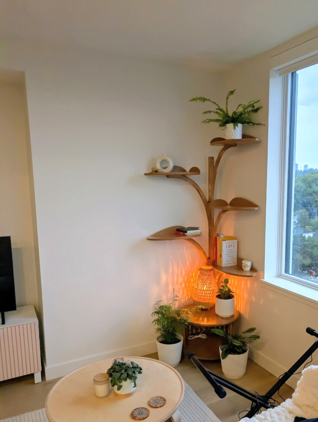 The leaves of this plant inspired bookcase are shaped in such a way to support various items in a thoughtful and curated manner. The design emerged from the family's love of plants, both indoors and outdoors, andtheir desire to build a home that tells a story. Through this piece, we complemented their already warm and inviting home, with a touch of play.