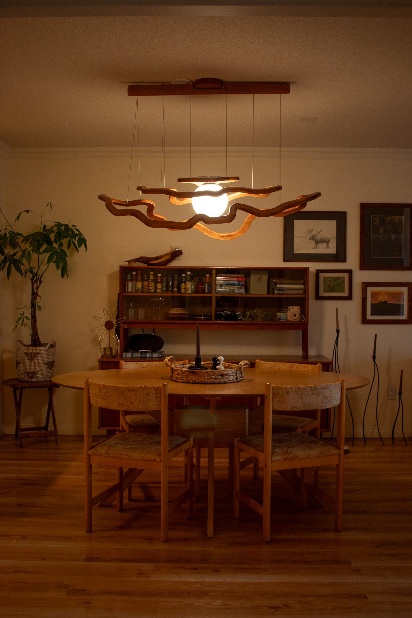 This unique pendant lights defies the natural rigidity of wood to create an abstract form that draws from the curves and bends found in tree rings, scraggly branches, and the light shining through them. It stemmed from an eclectic curation of art and wood pieces in this North Vancouver couple's home and their appreciation of the meandering trails of the nearby mountains.