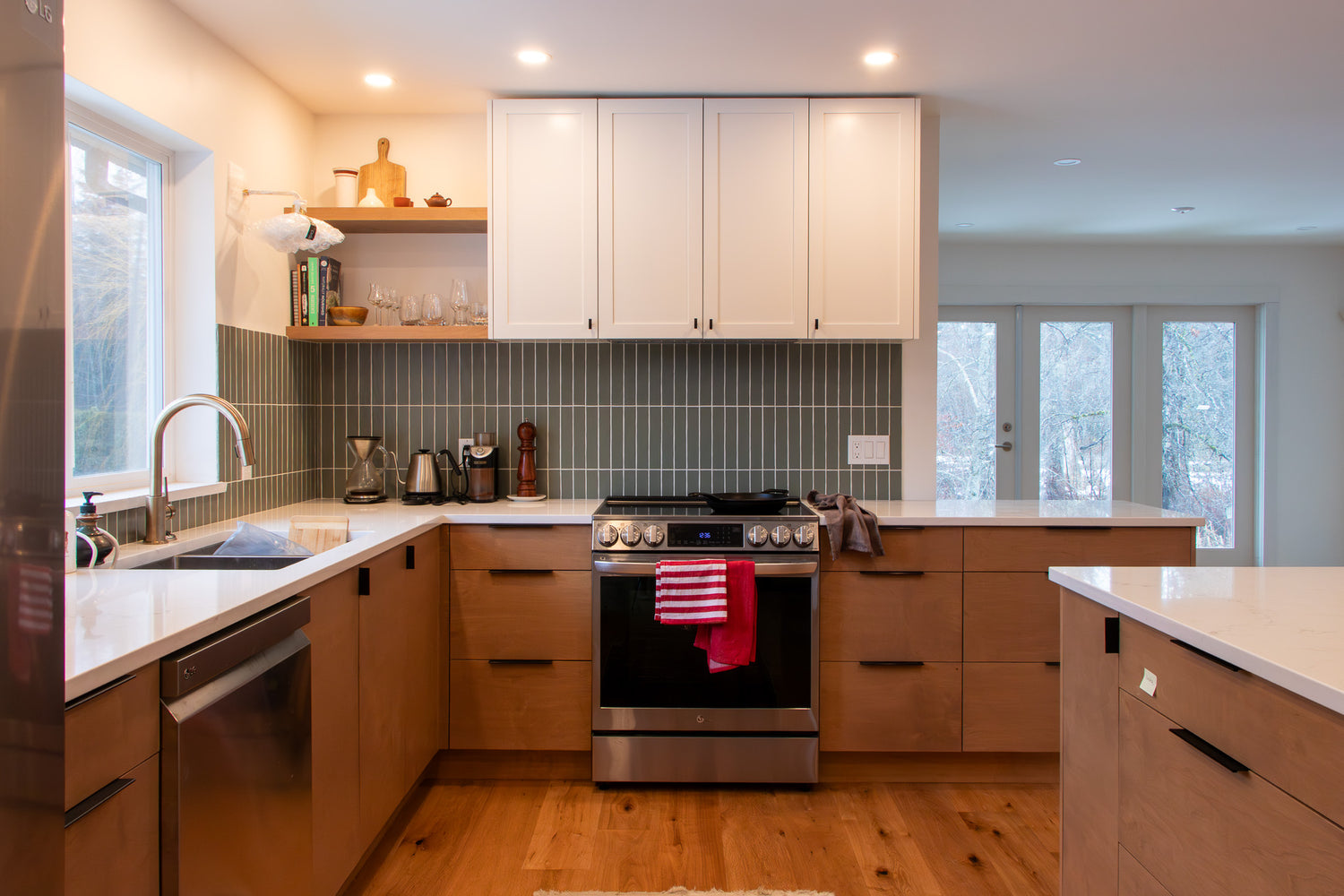 A beautifully grounded kitchen pairing muted tones of green with a warm brown stain on birch plywood complements the other natural elements in this home and the woody exterior.