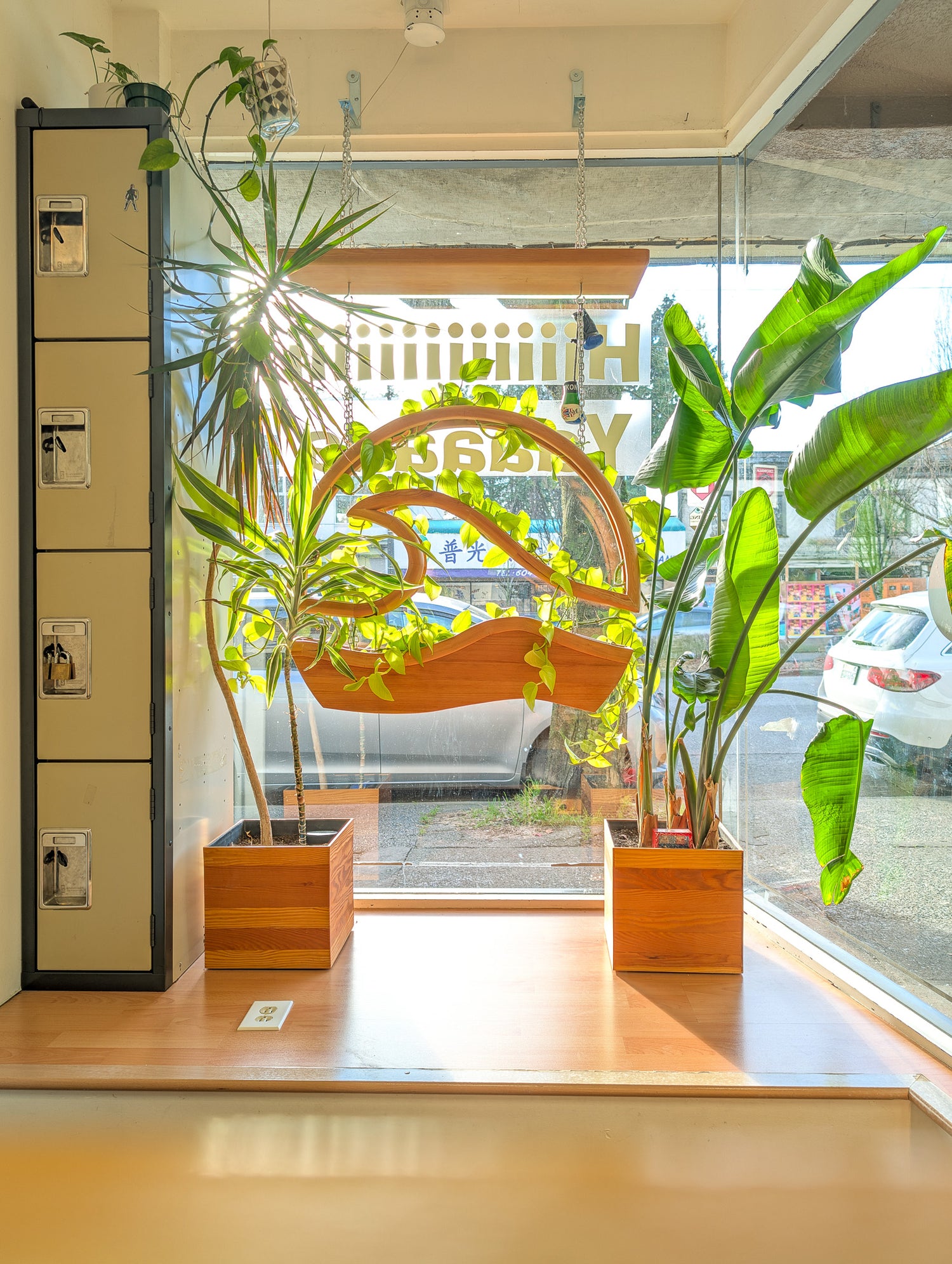 Incorporating nature into commercial spaces is not easy but this café has bright windows shinning onto these plants that double as a partition. Each plant has their own little sun hanging above it.