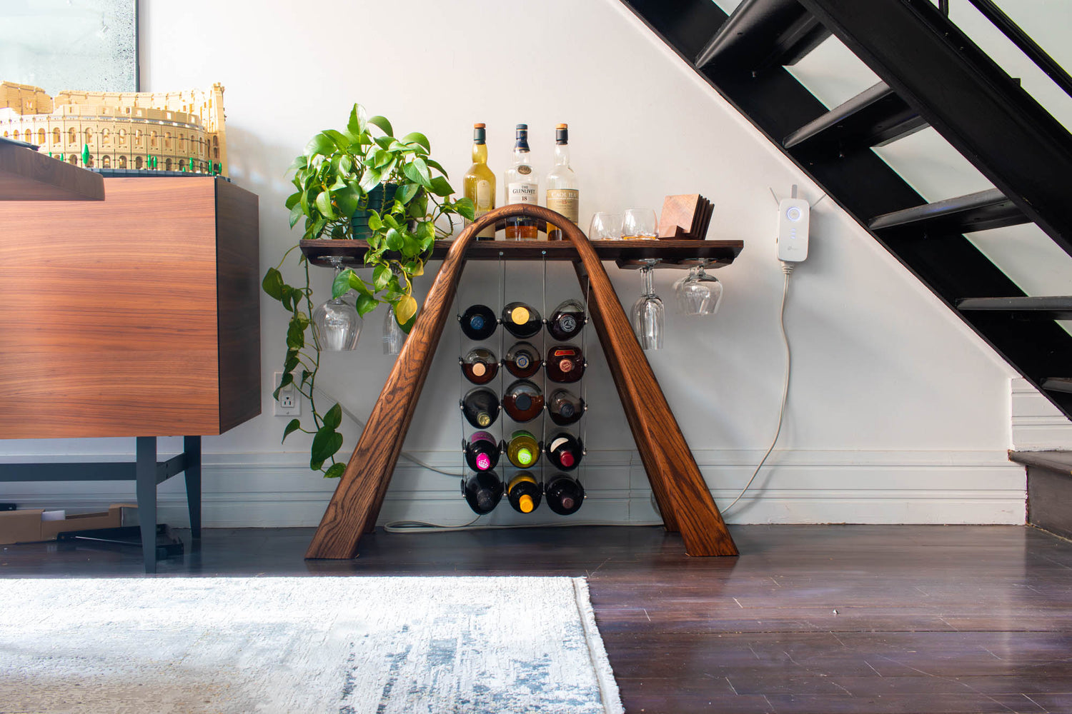 In an industrial style loft in Old Port, Montreal, sits this angled and intriguing wine rack and display piece. This home lies in the heart of art galleries and the resident called for a piece that expressed more than just function. Using mixed materials, and various methods of support, this piece is both functional and intriguing. going beyond the standard shelving units or bar carts.